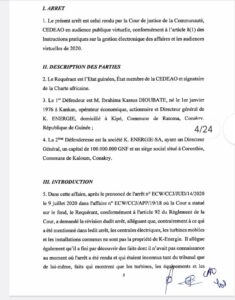 L’on se souvient qu’en 2020, sous le régime Alpha Condé, la cour de justice de la CEDEAO avait condamné l’Etat guinéen à verser 47,5 millions $ à K-Energie pour violation de ses droits.