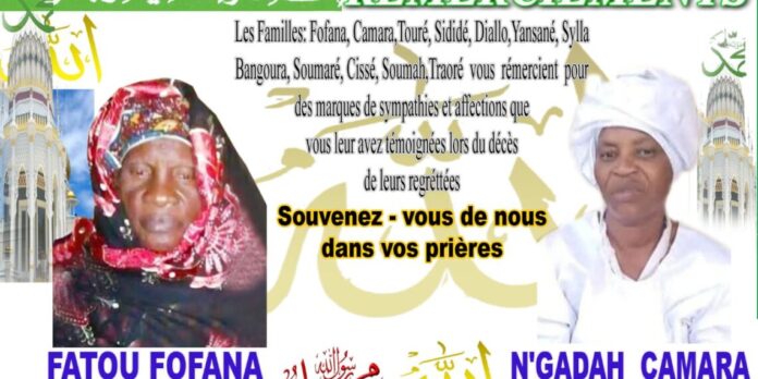 Les familles Fofana, Camara, Touré, Bangoura, Yansané, Traoré, Diallo, Cissé, Sidibé et Soumaré informent toutes les personnes qui ont compati à leur douleur lors du décès des regrettées Fatou Fofana et Ngada Camara, qu’elles organisent la cérémonie du sacrifice du 40e jour le dimanche 20 avril 2025 à Belle Vue, après la prière de 14 heures.