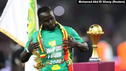 Sadio Mane célèbre sa victoire à la Coupe d’Afrique des Nations, Yaoundé, le 6 février 2022.