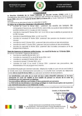 Dans un communiqué dont les copies ont été remis aux medias,la Direction Générale de la Caisse Nationale de Sécurité Sociale (CNSS) informe des pensionnés que Ie versement des pensions de retraite de l’échéance de février 2024 débutera le mardi 06 février 2024 sur toute l’étendue du territoire national.