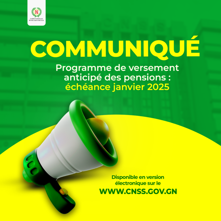 La Direction Générale de la Caisse Nationale de Sécurité Sociale (CNSS) informe les pensionnés qu’à titre exceptionnel, le versement des pensions de retraite et de réversion prévu pour janvier 2025 sera effectué de manière anticipée. Ce paiement commencera le mardi 24 décembre 2024 à partir de 8h00 sur toute l’étendue du territoire national et se déroulera selon le calendrier ci–après : Communiqué-paiement des pensions de retraite échéance 01-01-2025