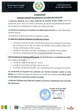 La Direction Générale de la Caisse Nationale de Sécurité Sociale (CNSS) informe les pensionnés qu’en raison de la fête de l’Aïd el-Fitr, les pensions de retraite et de réversion de l’échéance d’avril 2025 seront versées de manière anticipée.