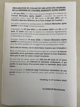 Dans une déclaration dont la rédaction de notre quotidien en ligne détient copie, le Collectif des avocats chargés de la défense de Colonel Mamadou Alpha Barry, exige l’ouverture d’un procès pour leur client en détention depuis déjà plusieurs années.
