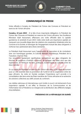 Selon le communiqué, cette visite officielle du Président de l’Union des Comores et Président en exercice de l’Union Africaine en Guinée pour une durée de 2 jours s’inscrit dans le cadre de marquer une nouvelle étape dans les relations de coopération bilatérale entre les Comores et la Guinée.