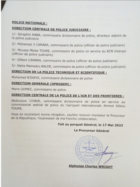 Le procureur de Général près de la cour d’appel de Conakry, Charles Alphonse Wright a dévoilé ce mardi 17 mai 2022 la liste du pool d’officiers de police judiciaire qui vont enquêter sur les crimes de sang conformément aux instructions, aux fins de poursuite judiciaire par voie de dénonciation contre l’ancien président Alpha Condé et plusieurs hauts cadres de son régime.