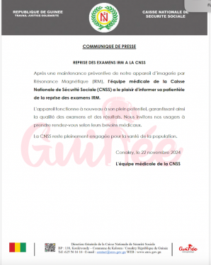 Après une maintenance préventive de notre appareil d’imagerie par Résonance Magnétique (IRM), l’équipe médicale de la Caisse Nationale de Sécurité Sociale (CNSS) a le plaisir d’informer sa patientèle de la reprise des examens IRM.