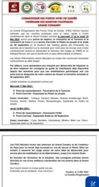 Le Comité d’Organisation des Forces Vives de Guinée (FSG) informe l’opinion nationale que les marches pacifiques pour le retour rapide à l’ordre constitutionnel dans le Grand Conakry prévues le mercredi 17 et le jeudi 18 Mai 2023, auront pour points de départs, le rond-point de la Tannerie et le rond-point de Cosa et pour points d’arrivées le Palais du peuple et le stade du 28 septembre où se tiendront des meeting géants afin d’interpeller les autorités de la transition sur la nécessité pour notre pays de renouer avec l’ordre constitutionnel normal en demandant la libération des otages du CNRD et un dialogue fécond, afin que la Guinée soit un pays démocratique et vertueux.