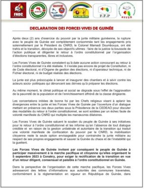 Les Forces Vives de Guinée saluent le soutien du peuple de Guinée à ses initiatives pour le retour à l’ordre constitutionnel et les informe qu’en l’absence de tout dialogue crédible et en raison de la gestion unilatérale et autoritaire de la transition qui traduit une volonté manifeste de confiscation du pouvoir par le CNRD, la mobilisation citoyenne reste la seule option envisageable pour contraindre la junte militaire au respect de ses propres engagements et sauver la Guinée du c aos et de l’instabilité qui la guettent.