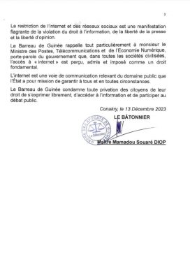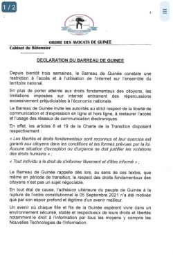 Dans la déclaration, le Barreau de Guinée a invité les autorités au strict respect de la liberté de communication et d’expression en ligne et hors ligne, à restaurer l’accès et l’usage des réseaux de communication électronique.