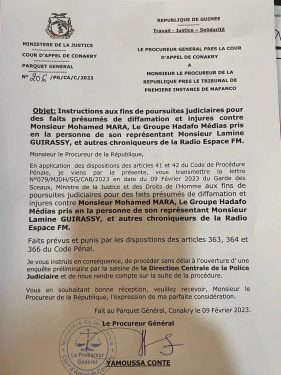C’est désormais officiel, quelques heures après les Injonctions du ministre Alphonse Charles Wright au procureur général près la Cour d’Appel de Conakry, d’engager des poursuites judiciaires contre Lamine Guirassy et Mohamed Mara, respectivement le président directeur général du Groupe Hadafo Médias et journaliste chroniqueur dans l’émission les ’’Grandes Gueules’’, pour les faits de diffamation et injures.