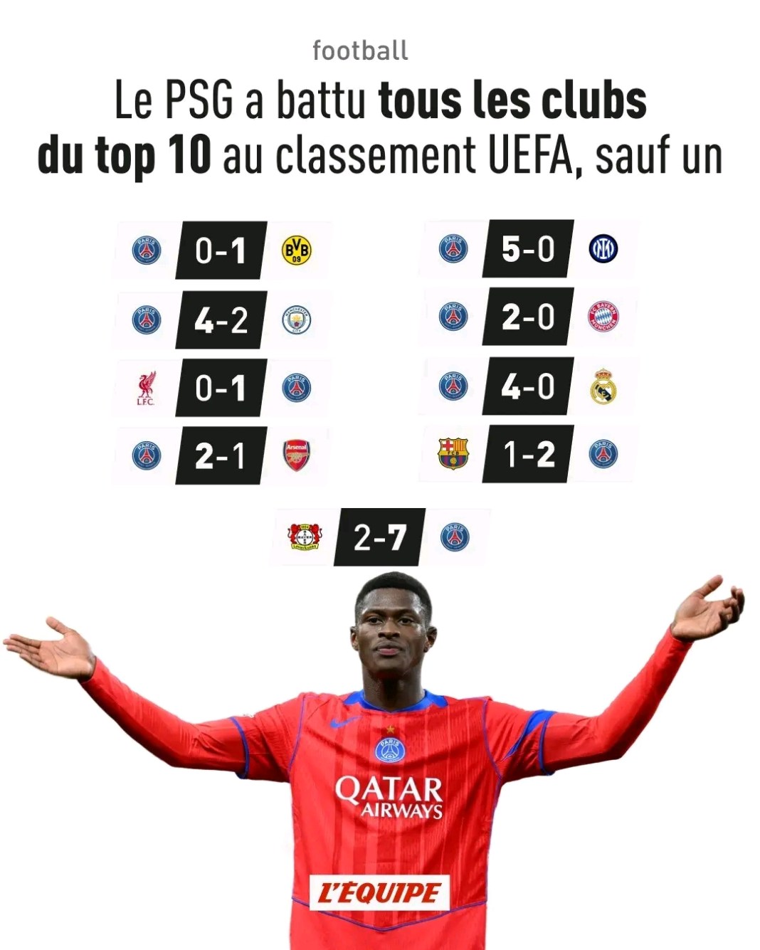 En 2025, hormis Dortmund, les Parisiens ont affronté toutes les équipes du top 10 au classement UEFA, qui classe les clubs d’Europe selon leurs parcours en C1, C3 et C4 lors des cinq dernières saisons. Avec ce nouveau succès, le PSG (6e du classement) a désormais battu l’ensemble de ces formations durant l’année civile.