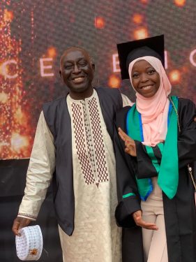 Présent à cette cérémonie de remise, le père de la lauréate, Dr Almamy Daouda Doumbouya, Enseignant chercheur de l’institut de Recherche et Développement des plantes Médicinales et Alimentaires de Guinée (IRDPMAG) s’est dit très honoré. « Je commence a dire que Dieu est la grandeur. Le précieux prix de distinction de l’université Ibn Tofail de Kenitra que ma fille a obtenu et Dédier à la Guinée toute entière par ma fille, est un grand honneur pour la famille Doumbouya en particulier, et une fierté pour sa source (la Guinée) en général. Makoya Doumbouya de la 1ère année de l’école primaire à l’université a été toujours 1ère de sa classe . son jeu favori si on me permet le terme, c’est les études . et ses amis ,ses, collaborateurs et collaboratrices c’est les bons élèves de sa classe. elle aime toujours fréquentée le milieu intellectuel. Je suis content et je rentre aux pays le week-end honoré. Dieu soit loué »