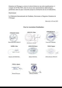 Dans leur préavis de grève, les membres de cette fédération, annoncent une série de manifestations à compter de ce 3 mai 2023 devant les sièges des représentations diplomatiques de la Guinée dans les pays concernés, et ce, jusqu’à la satisfaction de leurs revendications.