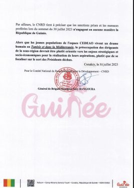 Peut être une image de texte qui dit ’Par ailleurs, le CNRD tient à préciser que les sanctions prises et les menaces proférées lors sommet du 30 juillet 2023 engagent en aucune manière la République de Guinée. Alors que les jeunes populations de l’espace CEDEAO vivent un drame humain Tunisie dans Méditerranée, préoccupation des dirigeants sous-région devrait être plutôt orientée vers les enjeux stratégiques et socio-économiques pour réalisation leurs aspirations, plutôt que de se focaliser sur le sort des Présidents déchus. Pour Comité National du Conakry le 31 juillet 2023 Développement- CNRD Ghet Générai Général de BrigadeShgahimaSor BANGOURA Guinée Samory Touré- Conakry, République Guinée’