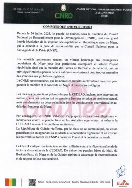 Suite aux événements survenus au Niger, le Comité National du Rassemblement pour le Développement (CNRD) a fermement exprimé son soutien envers les populations de ce pays ami, en soulignant l’importance des valeurs de panafricanisme chères au Chef de l’État, le Colonel Mamadi DOUMBOUYA.