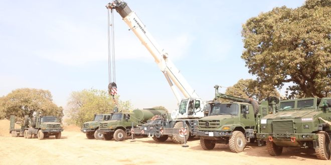 Destinée à la Direction centrale du génie militaire de l’armée burkinabè, l’aide comprend des véhicules spécialisés et des véhicules poids lourds, parmi lesquels une grue tout-terrain et une foreuse mobile avec compresseur pour le forage profond, a indiqué le chargé des affaires de l’ambassade d’Allemagne à Ouagadougou, Bernd von Münchow-Pohl. Elle comprend aussi deux systèmes de mise en bouteille d’eau potable avec une capacité de production de 700 bouteilles par heure, 26 containers de type « Hesco Raid » et d’autres matériaux pour un campement rapide et sécurisé sur le terrain, ainsi que plusieurs containers bureaux préfabriqués.